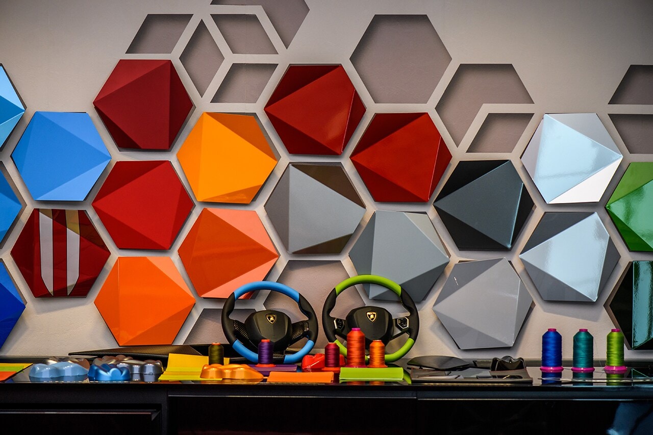 Before specifying their car, the prospective owner visits the factory on a guided tour, so he or she can view possible configurations on actual Huracán and Aventador models. Next, the customer is hosted in the sophisticated yet minimal atmosphere of the Ad Personam Studio, which includes displays of leathers, colors, materials, seats and rims, and includes an advanced car configurator for digital simulation of possible options. The lounge area is also used for displaying the particular Lamborghini model ordered by the customer.
