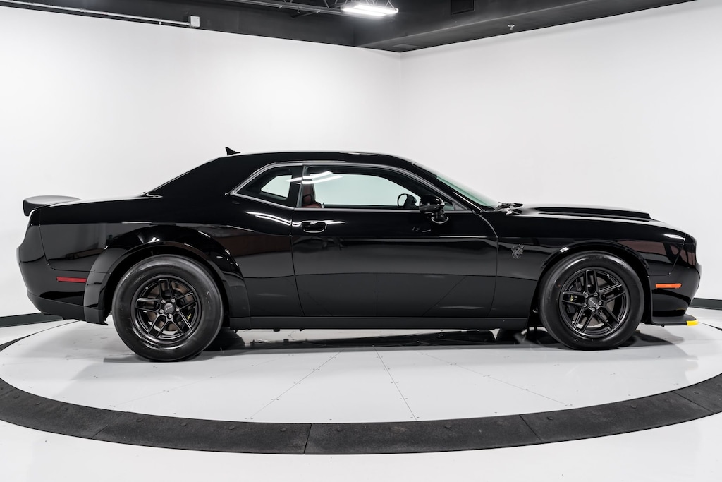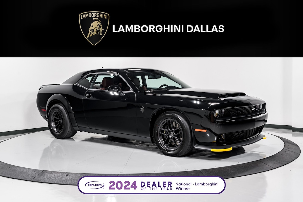 This is a smoke free Carfax certified 2023 Dodge Challenger SRT Demon 170 equipped with a 6.2L V8 Supercharged HO engine and a Torqueflite 8-speed automatic transmission. This car is an elegant Pitch Black exterior paint color and finished in a Black and Demonic Red leather interior along with Alcantara.