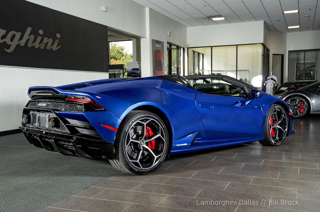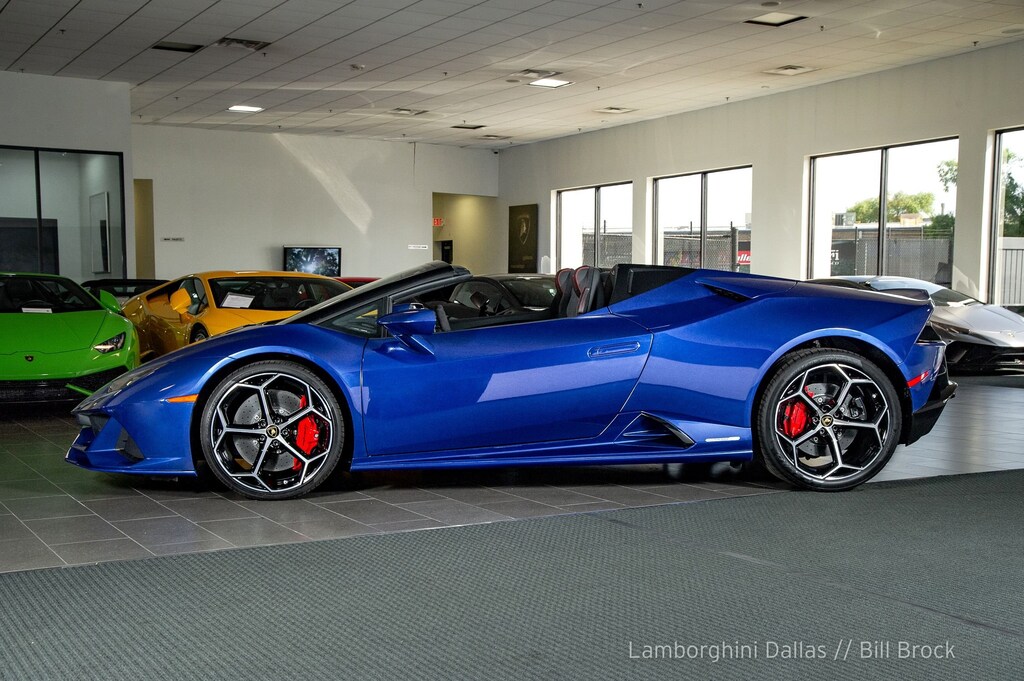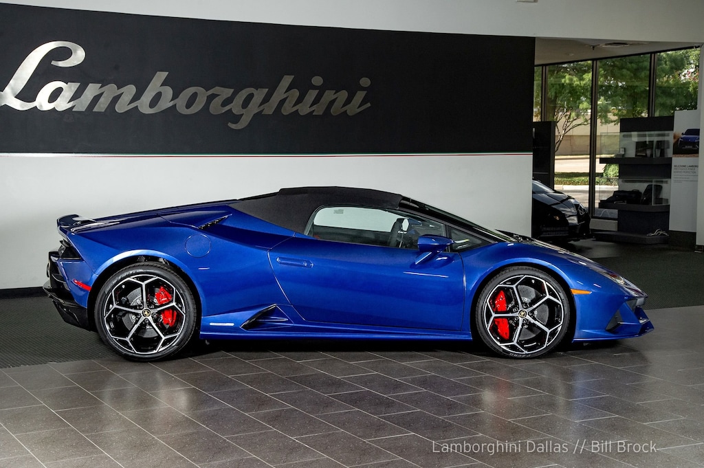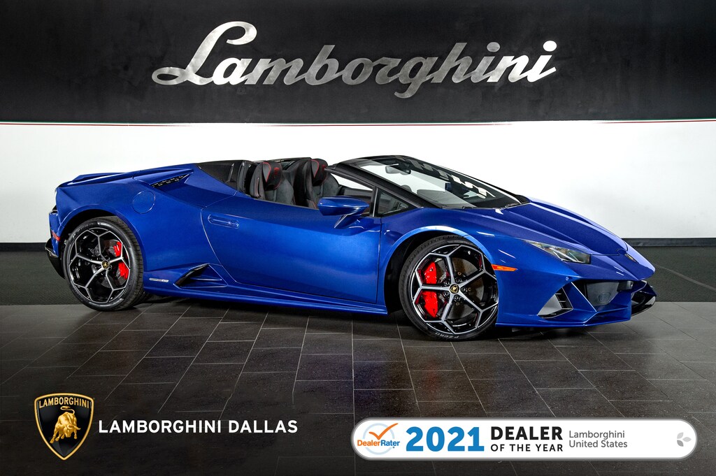 This is a smoke-free Carfax certified 2020 Lamborghini Evo Spyder equipped with a 640HP 5.2L, V10 engine, and a 7-speed LDF dual-clutch (auto & paddle shift) transmission with AWD and all-wheel steering. This car is finished in a beautiful Blu Sideris (Metallic Blue) exterior color and Nero Ade Alcantara and Leather (Black) interior along with contrast stitching throughout.