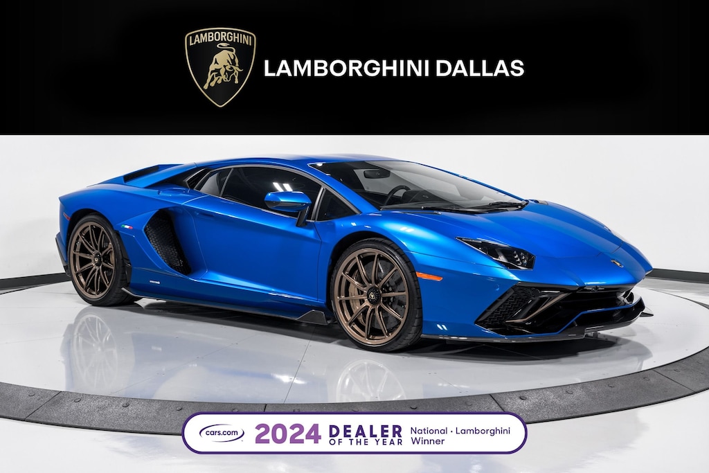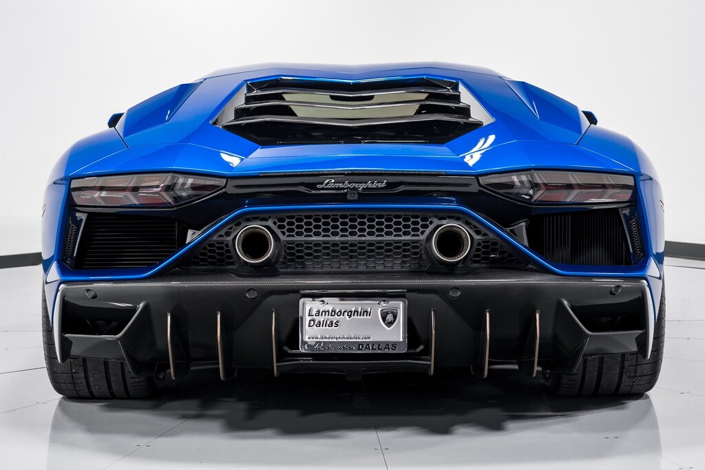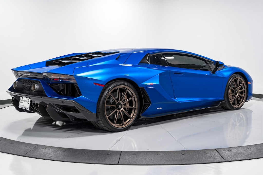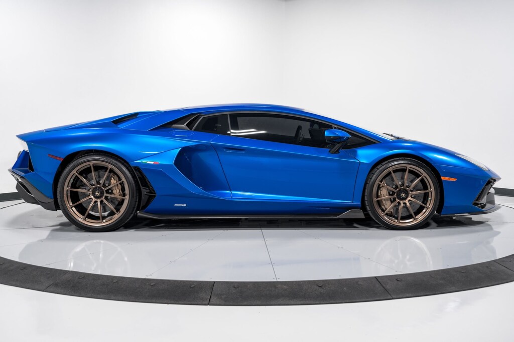 This is a 2022 Lamborghini Aventador Ultimae Coupe equipped with a 6.5L 769HP V12 engine, a 7-speed ISR (auto & paddle shift) transmission with AWD and 4 wheel steering system. This car is finished in a gorgeous Blu Tawaret (Blue Metallic) Ad Personam exterior color/ Livery with stripe Grigio (Grey) and Nero Cosmus (Black) full Alcantara interior along with contrast stitching throughout.
