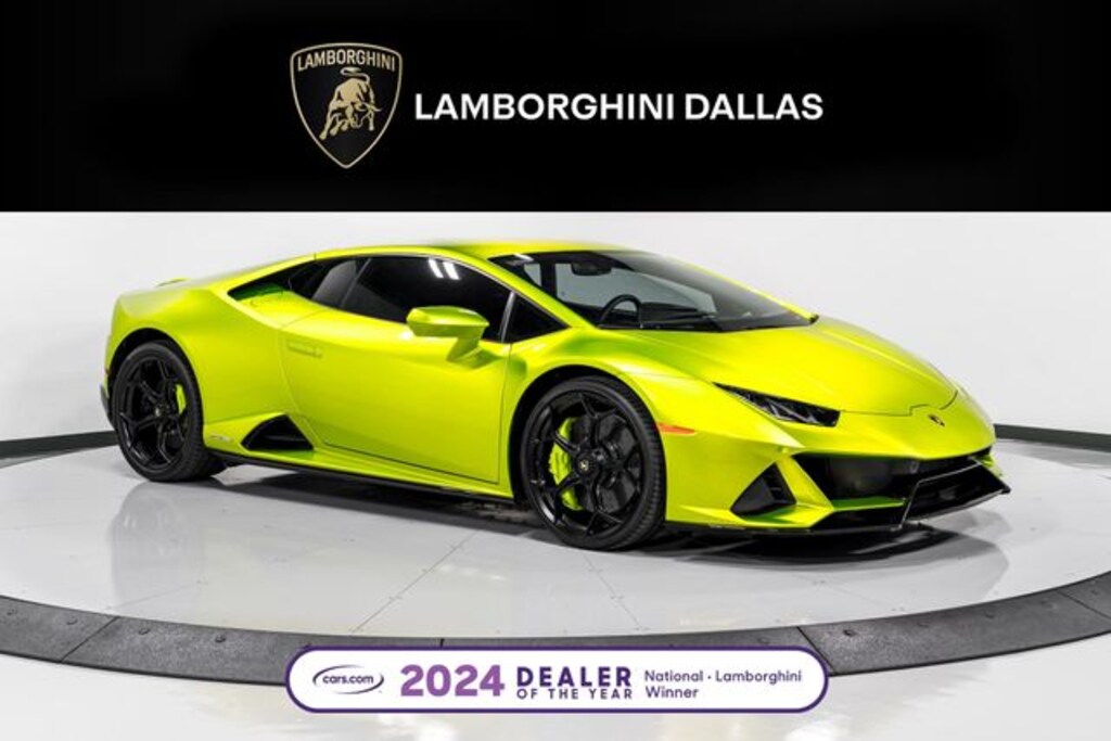 This is a smoke free Carfax certified 2023 Lamborghini Evo equipped with a 640HP 5.2L, V10 engine and a 7-speed LDF dual clutch (auto & paddle shift) transmission with AWD and AWS. This car is finished in a beautiful Verde Citrea (Pearl Green) exterior color and Nero Ade (Black) Leather and Alcantara interior along with contrast stitching throughout.