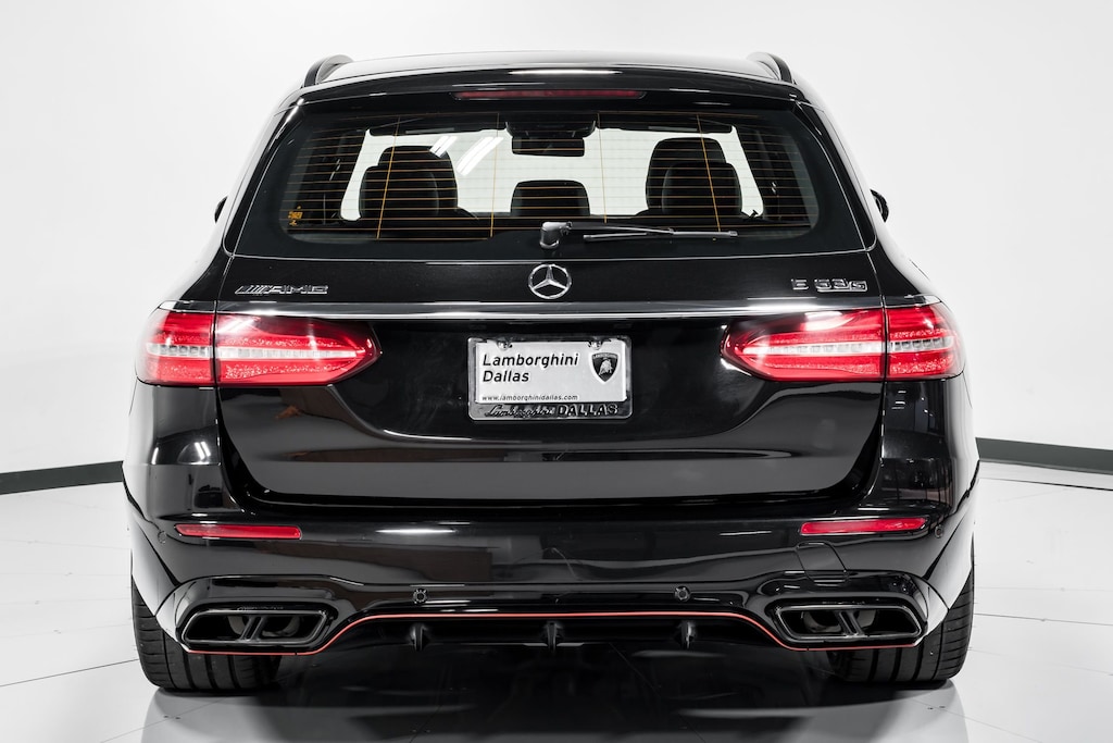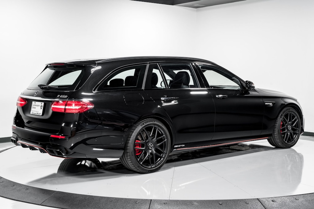 This is a smoke free Carfax certified 2018 Mercedes-Benz E63 AMG Wagon equipped with a 4.0L 603HP Bi-Turbo V8 engine and a 9-speed AMG (auto & sport shift) transmission. This car is finished in an Elegant Obsidian Black Metallic exterior color and Black full leather interior along with Silver contrast stitching throughout.