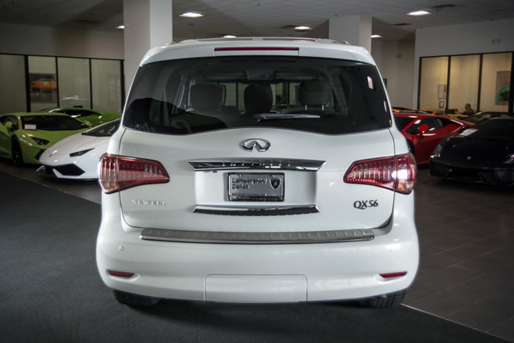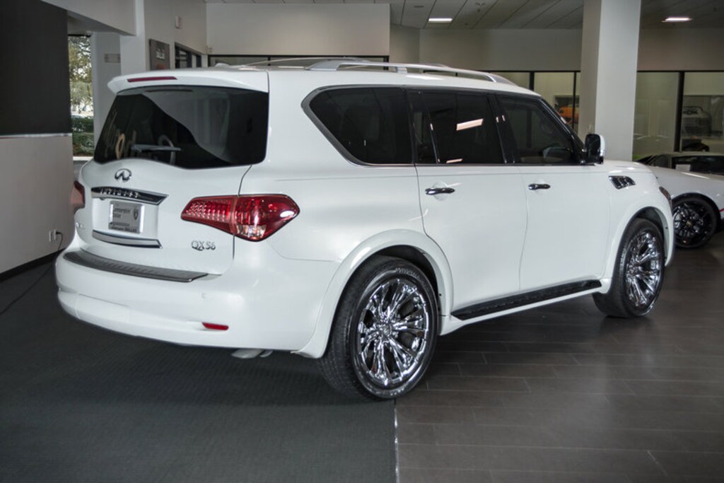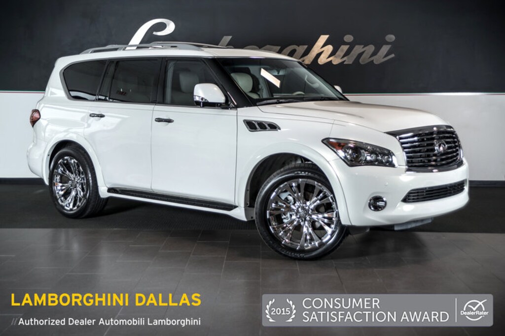 This is a smoke free Carfax certified 2012 Infinity QX56 equipped with a 5.6L V8 V8 engine and a 7-speed automatic transmission, and RWD. This car is finished in a beautiful Pearl White (Metallic white) exterior color and Tan leather interior along with Wood trim.
